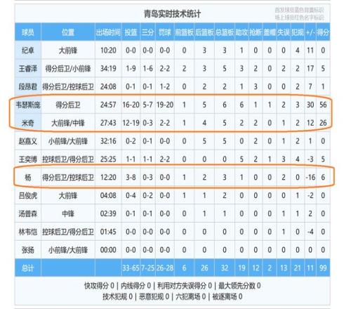 不过话又要说回来!韦瑟斯庞的厉害,我们不能够否认,但是,青岛队本场比赛一共是得了99分,然而,三名外援就得了88分,占了全队得分的89%。也就是说,青岛队所有本土球员加起来一共是得了11分, 占比11%。